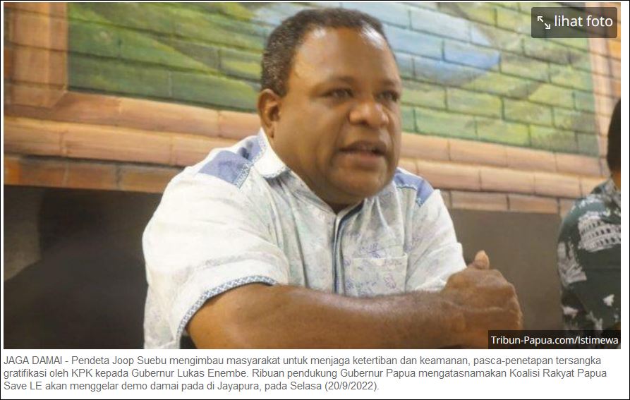 Informasi yang dihimpun Tribun-Papua.com, aksi massa nantinya untuk menolak kriminalisasi KPK terhadap Gubernur Papua. Merespon hal ini, Ketua Persekutuan Gereja Gereja Jayapura (PGGJ), Pendeta Joop Suebu, meminta seluruh masyarakat Papua untuk tenang. “Saya menghimbau kepada seluruh masyarakat di Papua tetap tenang menjaga situasi keamanan dan kamtibmas di Papua, dengan situasi hari-hari ini pak Gubernur Papua Lukas Enembe akan diperiksa oleh KPK. Biarkanlah hukum bisa berjalan,” ujar Suebu di Jayapura, Sabtu (17/9/2022). Menurutnya, aksi dukungan bagi Lukas Enembe sebetulnya telah memberikan edukasi politik yang salah kepada masyarakat.