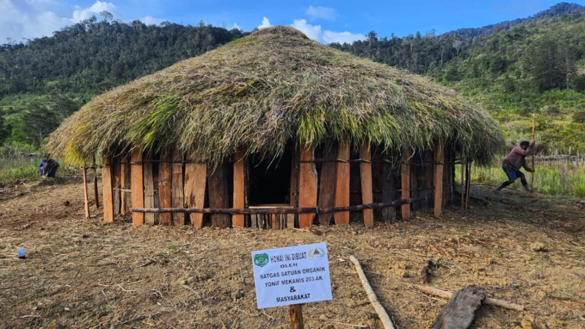 Dalam rangka menjaga dan melestarikan rumah adat, personel Pos Malagay Satgas Yonif Mekanis 203/AK membuatkan Honai atau rumah adat asli Papua milik Bapak Tekinus Wea yang bertempat di Distrik Malagay.