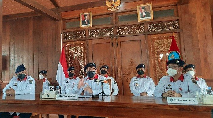 Kepala Badan Siber dan Sandi Negara (BSSN) Letjen TNI (Purn) Hinsa Siburian (tengah) dalam konferensi pers di Kantor BSSN Sawangan, Depok, Senin (7/3/2022).