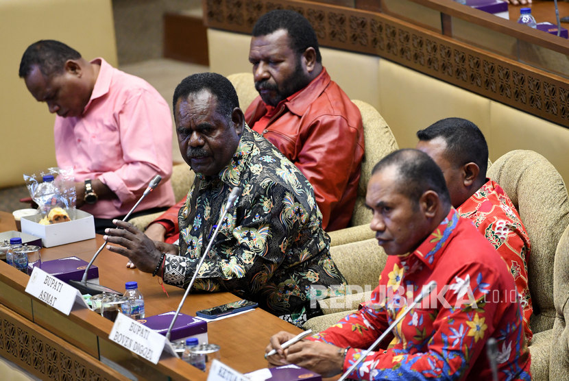 Bupati Asmat Elisa Kambu (kedua kiri) bersama sejumlah kepala daerah di wilayah selatan Provinsi Papua menyampaikan paparan saat beraudiensi dengan Komisi II DPR terkait usulan pembentukan Provinsi Papua Selatan di kompleks Parlemen, Jakarta, Rabu (11/12/2019). Menurut para kepala daerah dan perwakilan masyarakat asal kabupaten-kabupaten di wilayah selatan Provinsi Papua menilai pembentukan provinsi baru tersebut bertujuan mempercepat pembangunan. ANTARA FOTO/Aditya Pradana Putra/hp. *** Local Caption ***