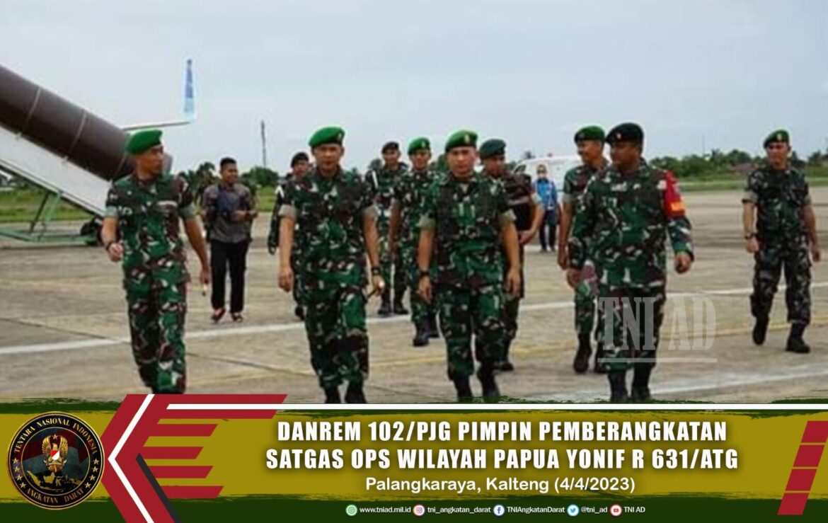 Jayapura – Bertempat di Bandara Tjilik Riwut, Palangka Raya Komandan Korem (Danrem) 102/Pjg Brigjen TNI Bayu Permana memimpin apel pemberangkatan prajurit Yonif R 631/Antang sebagai Satuan Tugas Pengamanan wilayah Obvitnas PT Freeport Indonesia di Wilayah Papua Tahun 2023 , Selasa (4/4/2023).