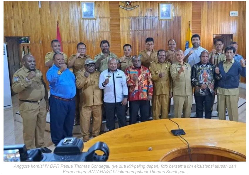 Dewan Perwakilan Rakyat (DPR) Provinsi Papua mengapresiasi tim eksistensi yang diutus oleh Kementerian Dalam Negeri (Kemendagri) dalam rangka pendataan aset daerah yang akan diserahkan ke tiga Daerah Otonomi Baru (DOB) di Bumi Cenderawasih. Anggota komisi IV DPR Papua Thomas Sondegau dalam siaran pers yang diterima Antara di Jayapura, Sabtu mengatakan selain itu, pihaknya juga memberikan apresiasi kepada delapan bupati di Provinsi Papua Tengah yang mendukung penuh rencana percepatan peresmian dan pelantikan Penjabat Gubernur Papua Tengah sebelum Desember 2022.