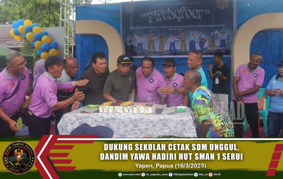 Jayapura – Komandan Kodim (Dandim) 1709/Yawa Letkol Inf Catur Prasetiyo Nugroho, S.IP., M.I.P, menghadiri peringatan HUT ke-53 SMAN 1 Serui, bertempat di halaman SMAN 1 Serui, Distrik Anotaurei, Kabupaten Kepulauan Yapen, Papua, Kamis (16/3/2023).