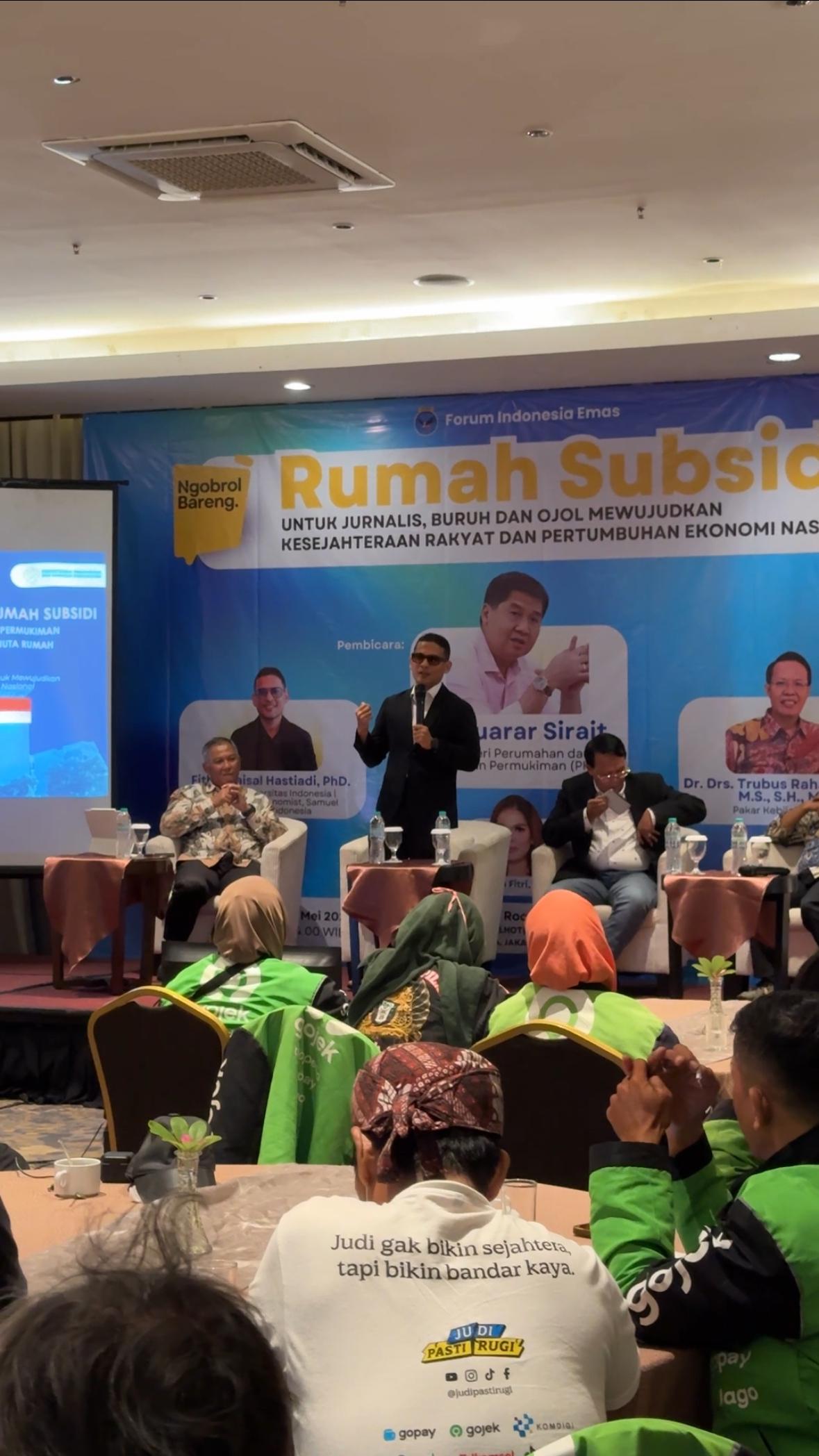 Niat baik ini dinilai penting untuk menjadi perhatian dan pemahaman masyarakat terutama bagi kalangan penerima manfaat, sehingga mendorong Forum Indonesia Emas (FIE) menyelenggarakan forum terbuka bertema “Ngobrol Bareng – Rumah Subsidi untuk Jurnalis, Buruh, dan Ojol Mewujudkan Kesejahteraan Rakyat dan Pertumbuhan Ekonomi Nasional”. Acara tersebut menghadirkan pembicara seperti Staf Ahli Bidang Sistem Pembiayaan, Pencegahan Korupsi dan Pemberdayaan Masyarakat Kementerian Perumahan dan Kawasan Permukiman, Budi Permana, Pakar Kebijakan Publik, Dr. Drs. Trubus Rahardiansah, M.S., S.H., M.H., dan Senior Chief Economist Samuel Sekuritas Indonesia, Fithra Faisal Hastiadi, PhD., serta Dosen Ilmu Komunikasi Universitas Indonesia, Nofia Fitri, M.Si. bertindak sebagai Moderator.