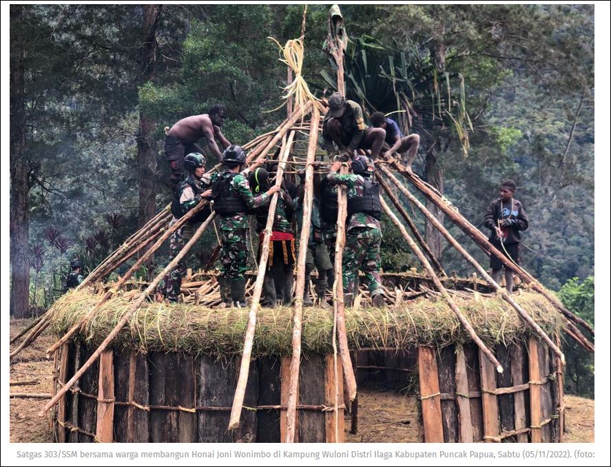 Dalam rangka meningkatkan semangat gotong royong dan kekeluargaan dalam kehidupan bermasyarakat, personel Pos Wuloni Satgas Satuan Organik Yonif R 303/SSM Kostrad membantu membuat Honai (Rumah adat asli Papua dari Suku Damal) milik Joni Wonimbo di Kampung Wuloni Distri Ilaga Kabupaten Puncak Papua, Sabtu (05/11/2022).