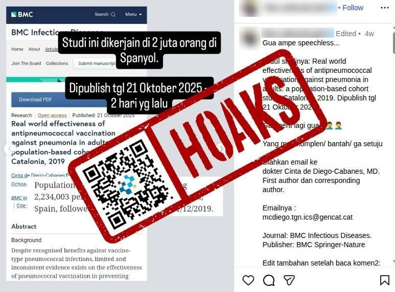Sebuah unggahan di Instagram kembali memicu kekhawatiran soal vaksin. Kali ini, narasinya menyebut bahwa vaksin pneumonia (PCV) justru meningkatkan risiko penyakit tersebut dan bahkan kematian. Klaim itu juga mempertanyakan efektivitas vaksin PCV pada anak, yang membuat banyak orang tua sempat ragu.