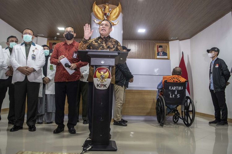 “Hadirnya KPK di Papua titik terjauh negeri kita adalah peringatan untuk seluruh pelaku korupsi dan bukti kehadiran negara untuk keadilan masyarakat Indonesia di Papua,” ujarnya Tersangka kasus dugaan korupsi pembangunan infrastruktur di Provinsi Papua Lukas Enembe dibawa petugas KPK untuk dihadirkan saat konferensi pers terkait penahanannya oleh KPK di Paviliun Kartika RSPAD Gatot Subroto, Jakarta, Rabu (11/1/2023). Gubernur Papua Lukas Enembe menjalani pembantaran usai ditangkap di Distrik Abepura, Kota Jayapura pada Selasa (10/1/2023).