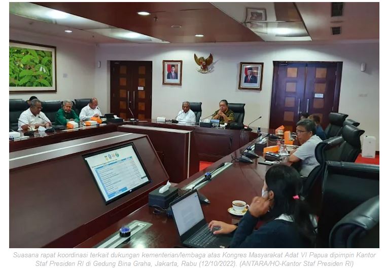 “Pelaksanaan Kongres Masyarakat Adat di tanah Papua membuktikan upaya-upaya merawat keberagaman dan toleransi di Indonesia,” kata Theofransus dalam keterangan pers yang diterima di Jakarta, Rabu. Theofransur menegaskan KSP mendukung kesuksesan kongres tersebut lewat rapat koordinasi yang dihadiri langsung Bupati Jayapura Matius Awotiauw selaku Ketua Umum Panitia Pelaksana Kongres Masyarakat Adat Papua didampingi Sekretariat Daerah Jayapura di Gedung Bina Graha, Jakarta, Rabu.
