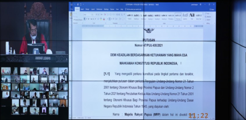 “Amar putusan mengadili, menyatakan permohonan Pemohon sepanjang pengujian Pasal 38 ayat (2), Pasal 59 ayat (3), Pasal 76 ayat (1), ayat (2) dan ayat (3) Undang-Undang Republik Indonesia Nomor 2 Tahun 2021 tentang Perubahan Kedua Atas Undang-Undang Nomor 21 Tahun 2001 tentang Otonomi Khusus Bagi Provinsi Papua serta Pasal 77 Undang-Undang Nomor 21 Tahun 2001 tentang Otonomi Khusus Bagi Provinsi Papua tidak dapat diterima; Menolak permohonan Pemohon selain dan selebihnya,” tegas Ketua MK Anwar Usman dalam sidang pengucapan Putusan Nomor 47/PUU-XIX/2021, Rabu (31/8/2022) di Ruang Sidang Pleno MK.