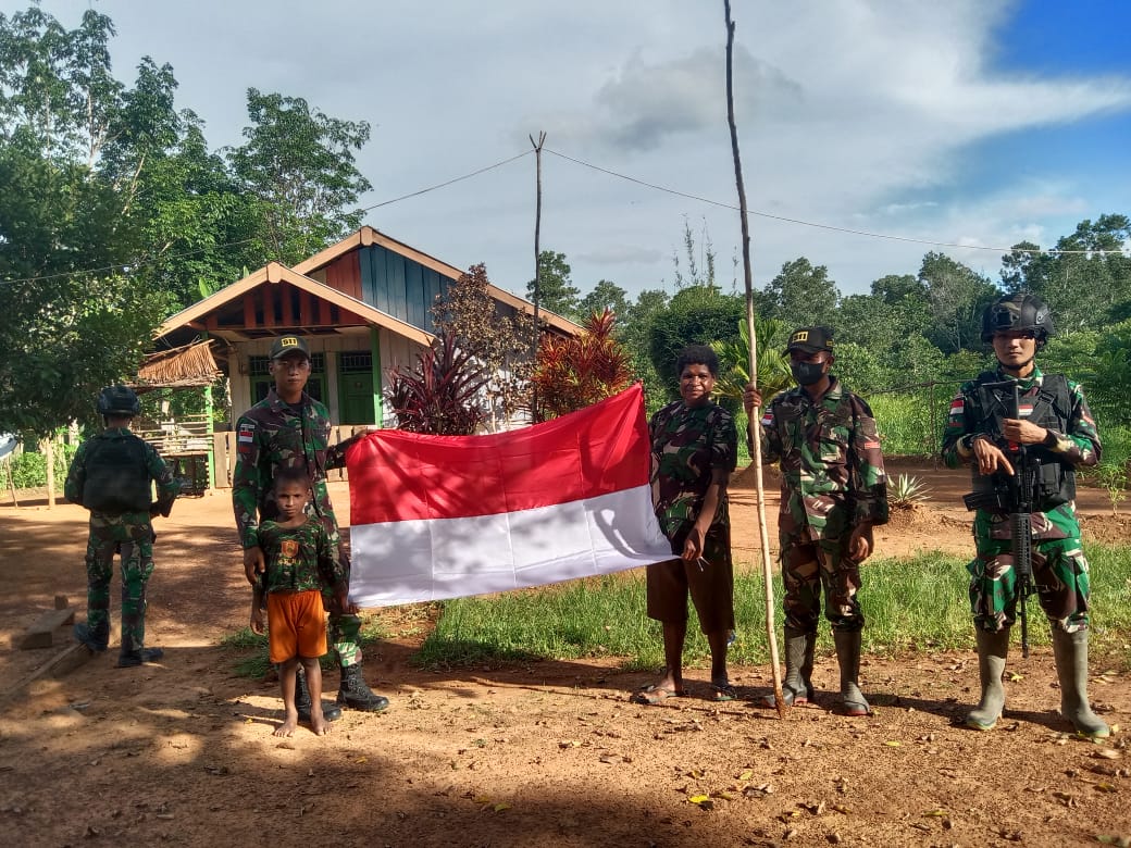 Mempersempit Pergerakan OPM, Satgas Pamtas RI-PNG Yonif 511/DY Membagikan Bendera Merah Putih Kepada Warga Di Tanah Papua