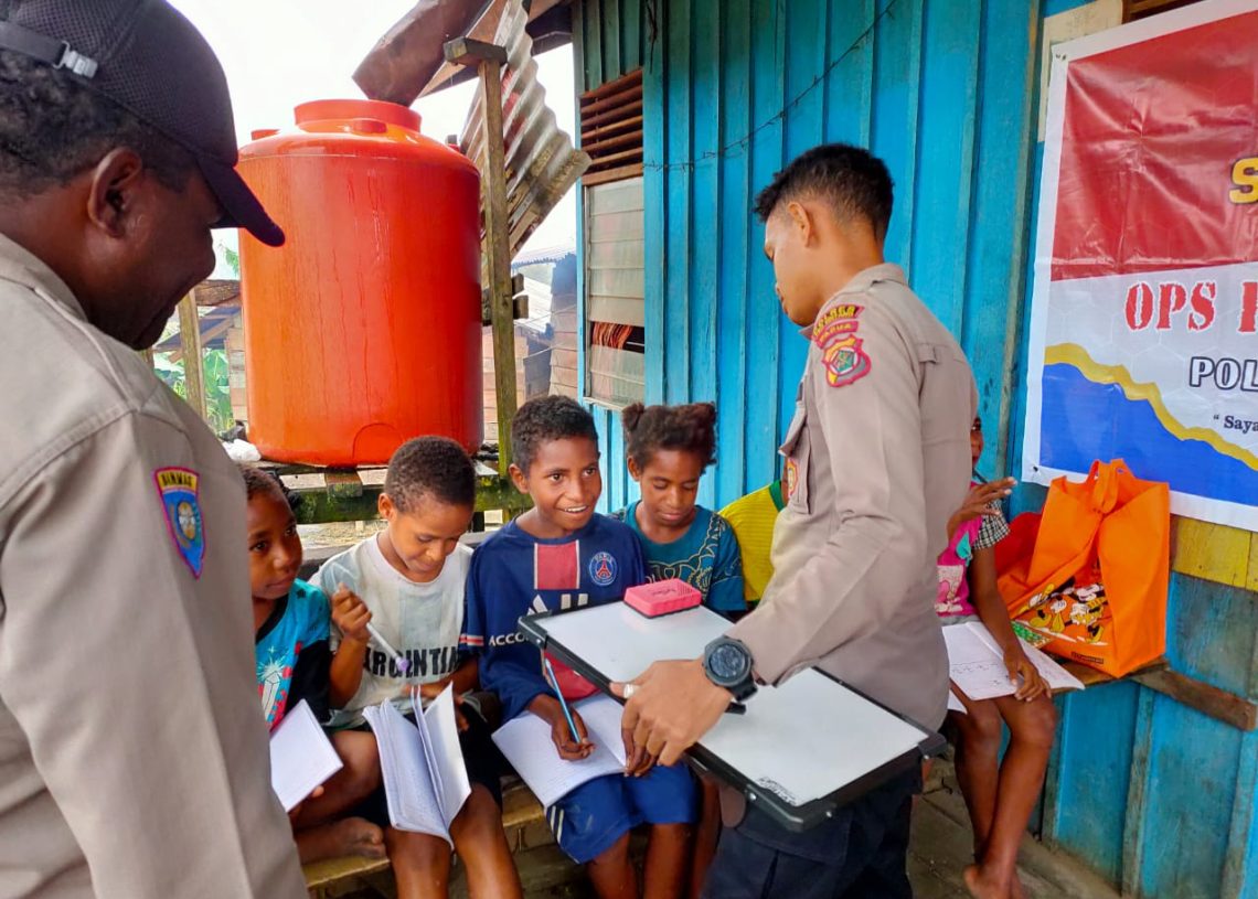 Jayapura – Satgas Binmas Ops Rasaka Cartenz 2023 wilayah Pegunungan Bintang Kembali laksanakan program Si Ipar (Polisi Pi Ajar) di Jl. Aldom Distrik oksibil dalam rangka mengedukasi anak – anak binaan, Jumat (17/03/23).