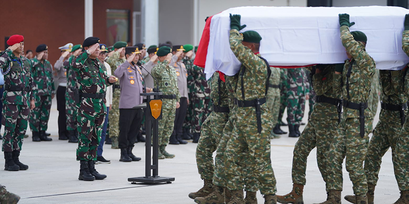 Panglima TNI Laksamana Yudo Margono pun menyampaikan ucapan duka yang mendalam atas gugurnya Pratu F, personel dari Satgas Yonif R 321/GT dalam kondisi meninggal dunia. Almarhum merupakan korban kelima yang gugur oleh serangan KKB Papua di Mugi-Mam Nduga, Sabtu (15/4/2023).
