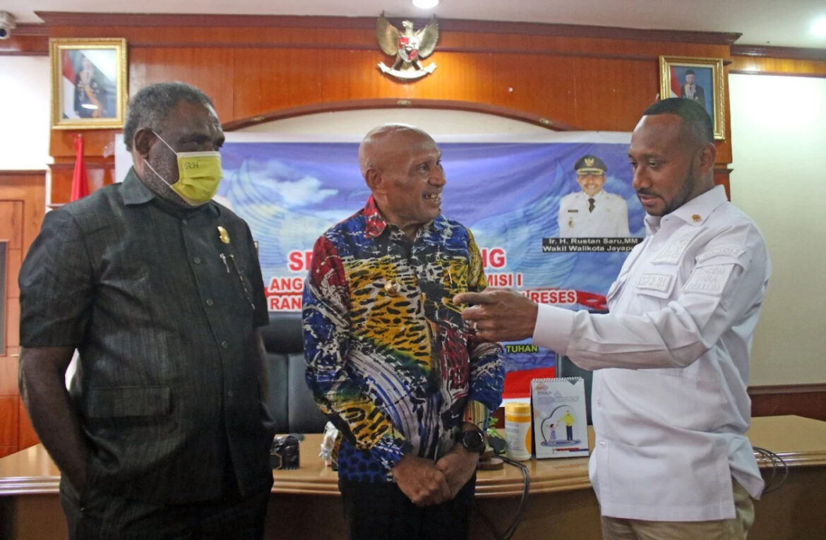 Anggota Komisi I DPR RI Yan Mandenas (kanan) bersama Wali Kota Jayapura Benhur Tomi Mano (tengah) dan Ketua DPRD Kota Jayapura Abisai Rollo seusai mengadakan pertemuan di Kantor Wali Kota Jayapura, Entrop, Jayapura, Papua. Foto: Humas DPR RI