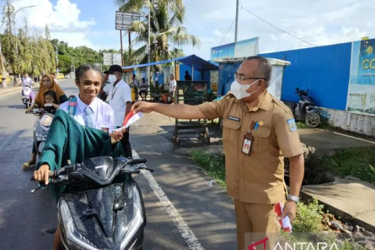 Pejabat dan staf di lingkungan pemerintah Kota Sorong, Senin, turun ke jalan kawasan kampung baru untuk membagikan bendera merah putih kepada masyarakat yang melintas.