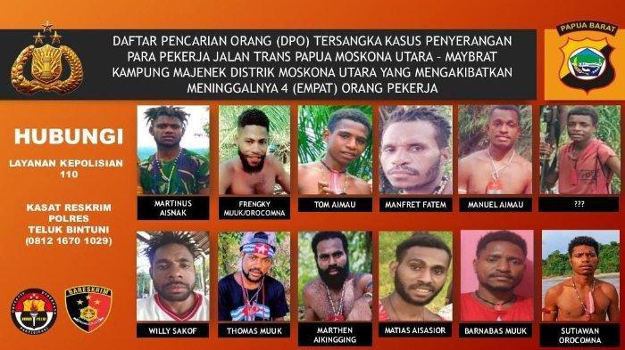 Sebanyak 12 pelaku pembunuhan terhadap empat pekerja Jalan Trans Papua Barat, di Teluk Bintuni kini sudah dijadikan daftar pencarian orang (DPO) oleh Polda Papua Barat. Ke-12 pelaku tersebut pun foto-fotonya sudah disebar oleh pihak Kepolisian setempat. Dari 12 pelaku tersebut, dua di antaranya diketahui masih anak-anak atau di bawah umur.