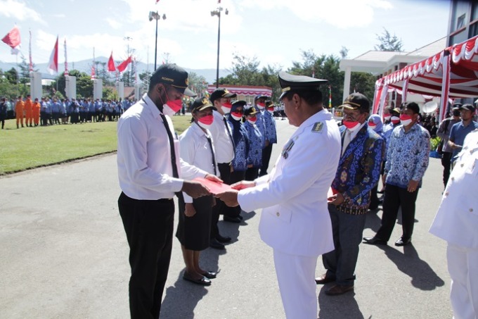 Perayaan HUT ke-77 Republik Indonesia di Kabupaten Jayawijaya dilaksanakan dengan meriah, Ya, selain upacara bendera detik-detik proklamasi juga ada penyerahan SK Aparatur Sipil Negara (ASN) angkatan 2018, penyerahan Buku Muatan Lokal Bahasa Daerah yang akan diterapkan untuk jenjang pendidikan Paud, TK dan SD Kelas I, selain itu ada juga pemberian doorprize bagi peserta upacara, tari-tarian dan lomba panjat pinang.