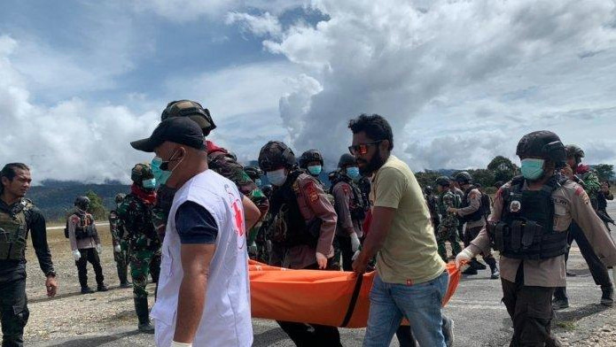 Delapan jenazah karyawan Palapa Timur Telematika korban KKB di Beoga Kabupaten Puncak, berhasil dievakuasi ke Timika, Senin (7/3/2022).