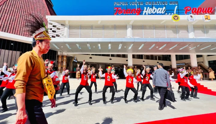 Di sepanjang jalan menuju bangunan PYCH, tampak pula sejumlah anak muda Papua yang merupakan anggota PYCH dengan kompak menyanyikan lagu daerah “Yamko Rambe Yamko” sambil menari untuk menyambut kedatangan Presiden Jokowi.