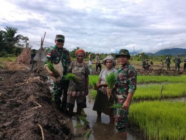 Satgas Yonif 126/KC Pos Batom membantu para petani menanam padi di Kampung Batom