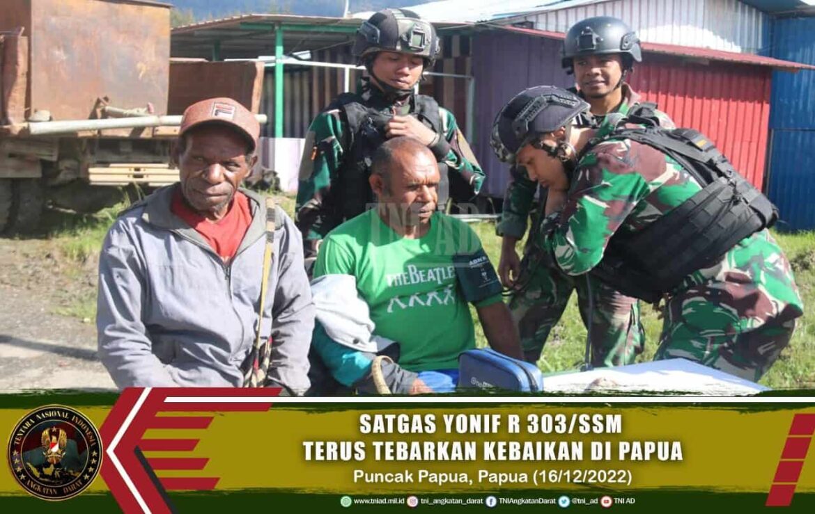 Satgas Satuan Organik Yonif R 303/SSM terus menebarkan kebaikan ke pada masyarakat di daerah penugasan, kali ini dengan menggelar pelayanan kesehatan gratis dan pembagian makanan.