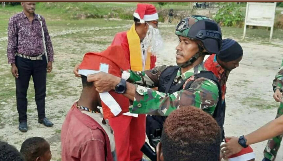 Prajurit TNI Satgas Yonif Raider 514/SY Kostrad Bondowoso berbagi kasih dan suka cita bersama anak-anak dalam perayaan Natal 2022 di wilayah penugasan Nduga Papua Pegunungan. Mengenakan pakaian sinterklas, prajurit Yonif Raider 514/SY membagikan kado Natal kepada anak-anak Kampung Batas Batu, Kenyam, Nduga.