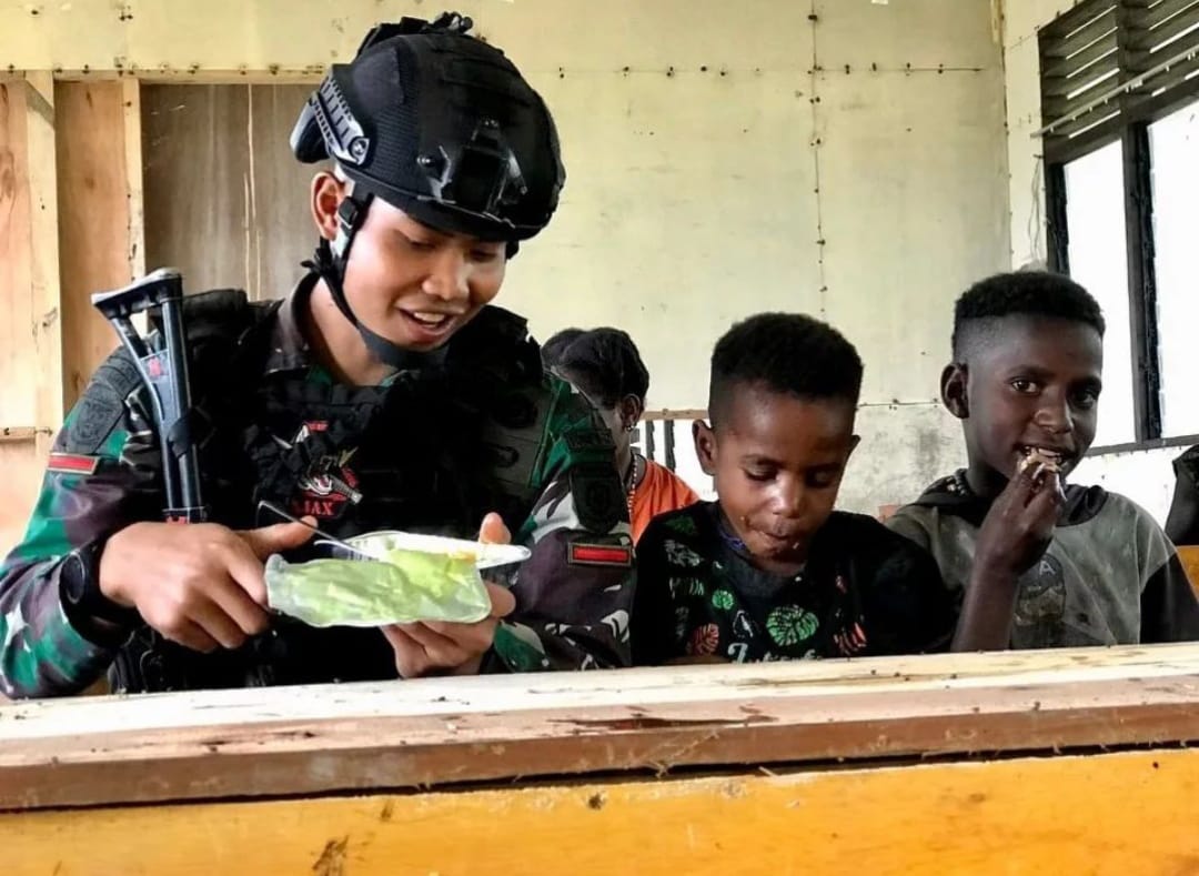Puluhan personil dari Satgas Yonif Raider 321/GT/13/1 Kostrad siang itu berkumpul bersama dengan anak-anak dan warga di Distrik Yigi, Pegunungan Tengah, Papua.