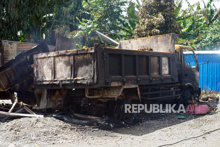 Satu unit truk hangus terbakar akibat kerusuhan massa di Wamena, Papua, Jumat (24/2/2023). Kapolda Papua Irjen Mathius D. Fakhiri menyebutkan kerusuhan yang dipicu isu penculikan anak tersebut mengakibatkan 10 orang tewas, puluhan orang luka-luka, dan belasan bangunan serta kendaraan bermotor hangus terbakar.© Antara/Iwan Adisaputra