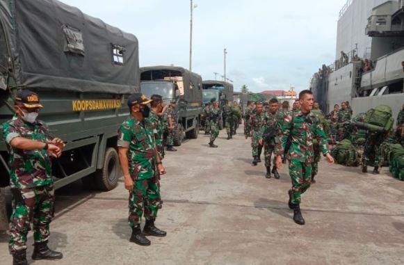 Manokwari – Sebanyak 200 pasukan organik TNI AD dari Satgas Yonif 136/Tuah Sakti tiba di Pelabuhan Laut Manokwari, Papua Barat, Minggu (3/4/2022). Kedatangan ratusan personel yang menggunakan KRI Teluk Bintuni 520 dijemput langsung Komandan Kodim (Dandim) 1801/Manokwari Letkol Inf Rachmat Christanto.