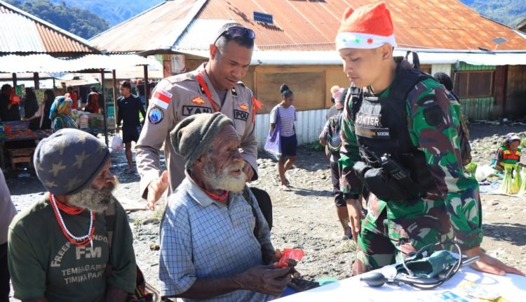 Puncak. TNI-Polri bersinergi memberikan pelayanan prima kepada masyarakat di Distrik Ilaga Kabupaten Puncak, Papua. Salah satunya dengan melakukan kegiatan pengobatan dan memberikan makanan kepada masyarakat secara gratis, Jumat (23/12/22).