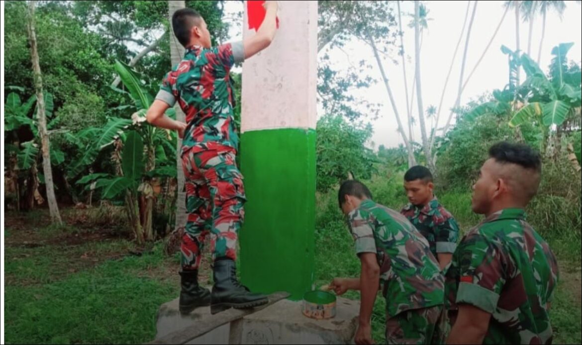 Sebagai wujud peduli terhadap keindahan kampung, personel Satgas Yonif 123/Rajawali (RW) Pos Kondo turut menuangkan kreativitasnya melalui kegiatan Karya Bhakti mengecat ulang gapura Kampung Kondo sebagai simbol selamat datang di wilayah terpencil Indonesia tersebut.